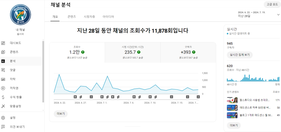2024 하반기 최근 1달 동안 다시 유튜브 채널을 열심히 키우고 있는 웹서퍼입니다.